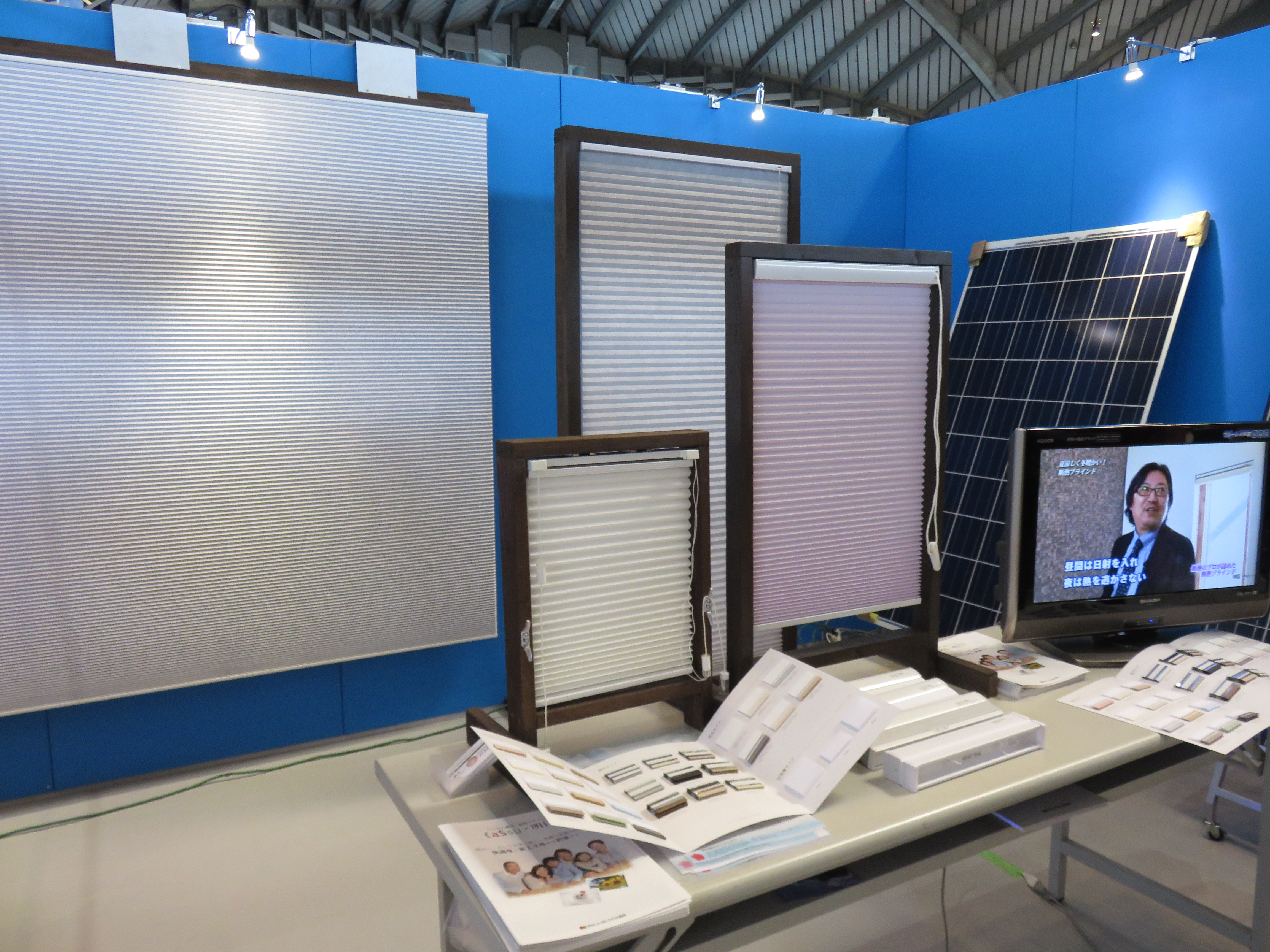 ブースでは、ハニカム構造断熱ブラインドや、アルミサッシと樹脂サッシの性能比較、太陽光パネル、換気システムなどに関する展示を行い、3日間で専門業者の方、一般の方を含め、多くの方に足を運んでいただきました。